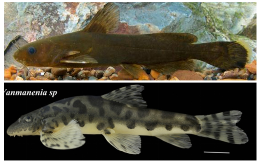 ▲拟鲿属新种(上)、原缨口鳅属新种(下) 。(邵韦涵、郭东明/摄)