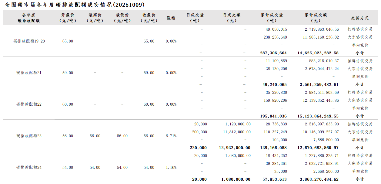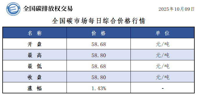 【CEA】全国碳市场每日综合价格行情及成交信息20251009