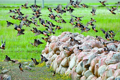 在新疆,“粉色精灵”则是著名的灭蝗卫士。这些“粉色精灵”是粉红椋鸟,是国家保护的有重要生态、科学、社会价值的陆生野生动物。新疆是它们在我国境内唯一的繁殖区。粉红椋鸟以蝗虫为主要食物,且食量惊人。在育雏期,成鸟每天能捕捉三四百只蝗虫,进食数量在120只至170只。有时,它们一天捕食的蝗虫重量能超过自己的体重,因此被牧民们亲切地称作“草原铁甲军”。