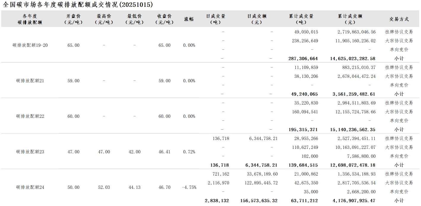 【CEA】全国碳市场每日综合价格行情及成交信息20251015