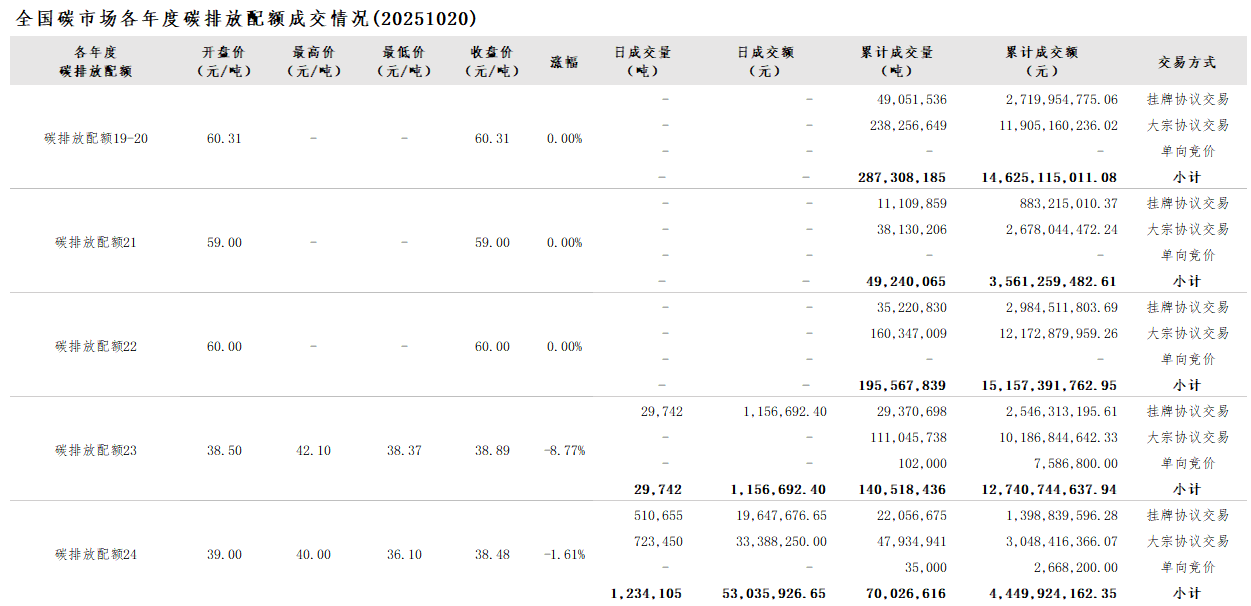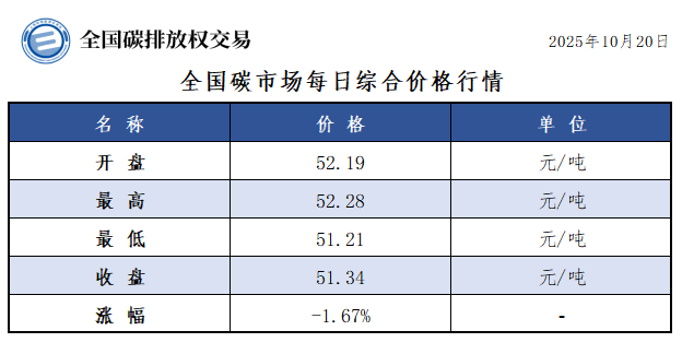 【CEA】全国碳市场每日综合价格行情及成交信息20251020