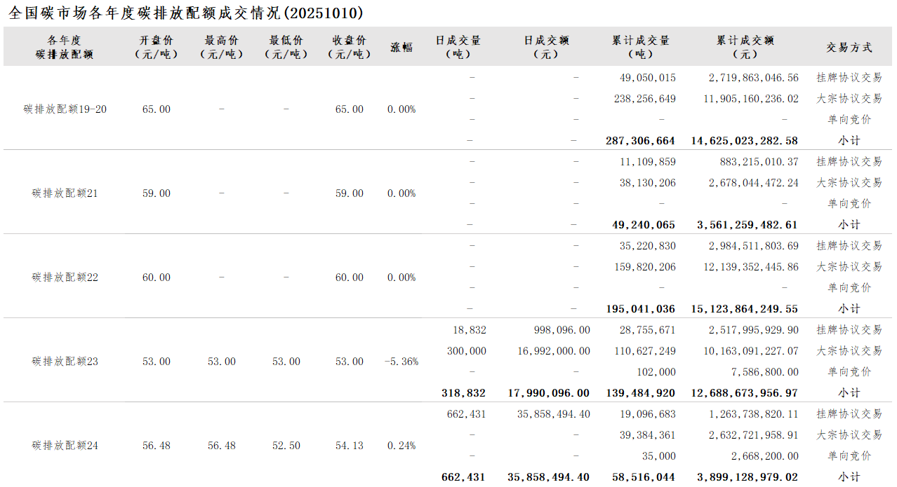 【CEA】全国碳市场每日综合价格行情及成交信息20251010