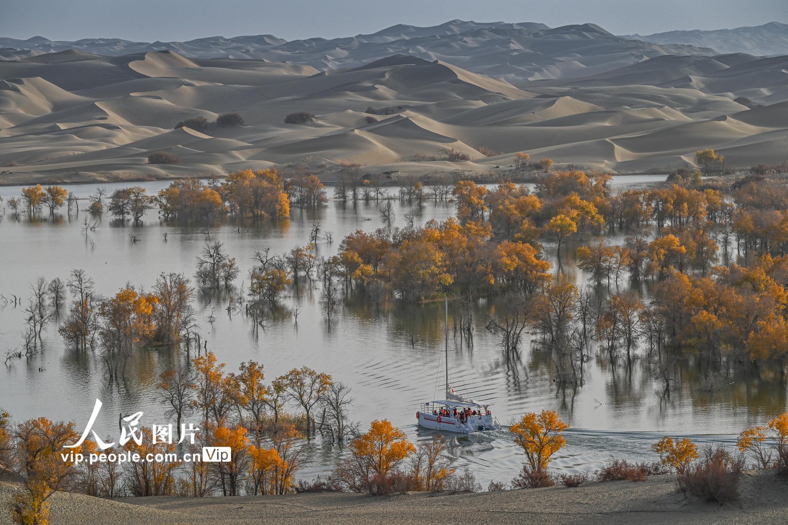 2025年10月26日,新疆维吾尔自治区尉犁县葫芦岛景区,游客乘船游览,欣赏大漠胡杨美景。韩峻摄(人民图片网)