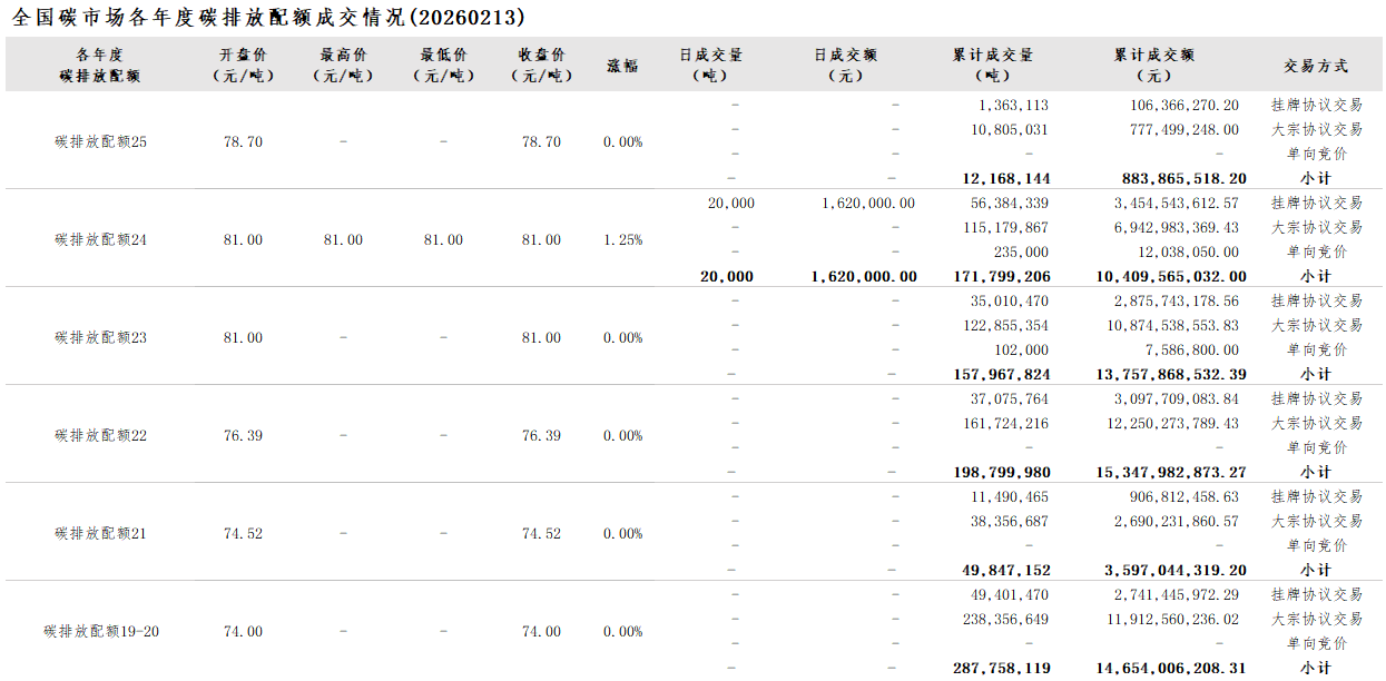2026年1月1日至2月13日,全国碳市场碳排放配额成交量13,473,905吨,成交额987,714,251.80元。