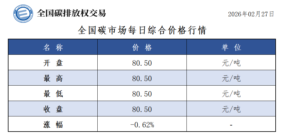 【CEA】全国碳市场每日综合价格行情及成交信息20260227