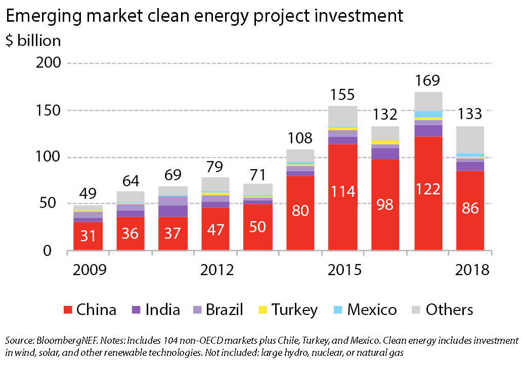 但是,下降幅度不仅仅限于中国。印度和巴西的清洁能源项目流入分别比上一年度减少了24亿美元和27亿美元。在接受调查的所有新兴市场中,2018年的投资额降至1,330亿美元,不仅低于2017年的总投资额,还低于2015年的数字。总体而言,太阳能和风能成本的下降在新兴经济体的美元绝对投资额下降中起到了重要作用。