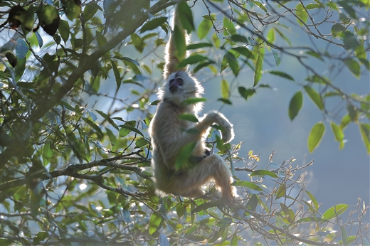 20世纪50年代,东黑冠长臂猿曾被国际权威的灵长类专家宣布已经在野外灭绝,直到2006年,专家在中越边境进行的一次野外调查发现了它们的踪迹,才让这一物种重回人们的视野。这片位于广西靖西市与越南高平省重庆县交界处的喀斯特季雨林,成为仅存的100多只东黑冠长臂猿在这个星球上最后的栖息地。中国境内,在当地党委、政府和保护区的多年努力下,东黑冠长臂猿种群数量由当初的3群21只发展到目前的5群33只。