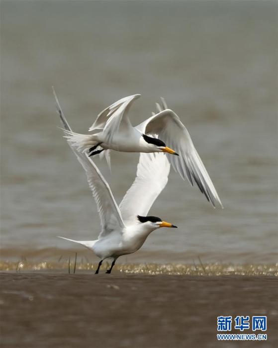 4月19日,大凤头燕鸥在闽江河口湿地的江滩上觅食、嬉戏 新华社记者 梅永存摄