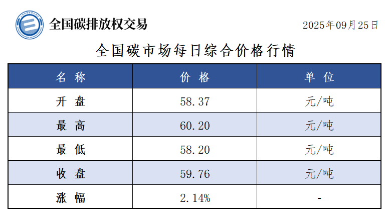 【CEA】全国碳市场每日综合价格行情及成交信息20250925