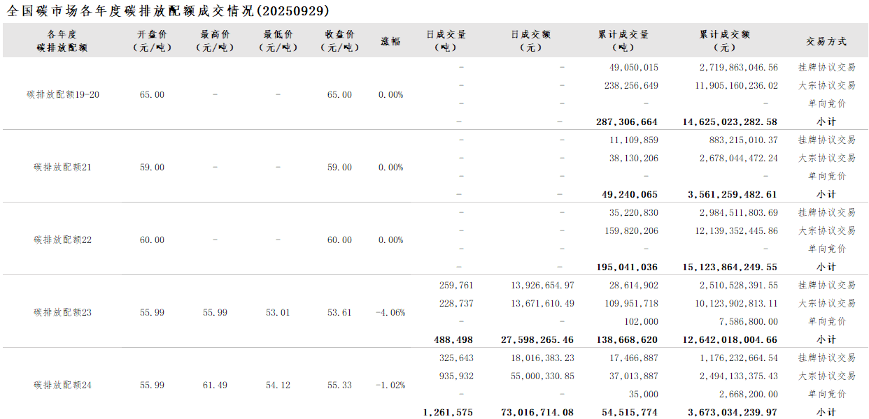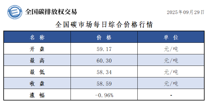 【CEA】全国碳市场每日综合价格行情及成交信息20250929