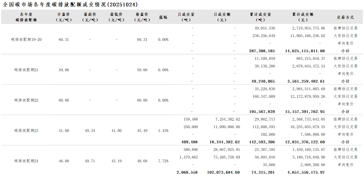 截至2025年10月24日,全国碳市场碳排放配额累计成交量749,024,596吨,累计成交额50,826,698,555.21元。