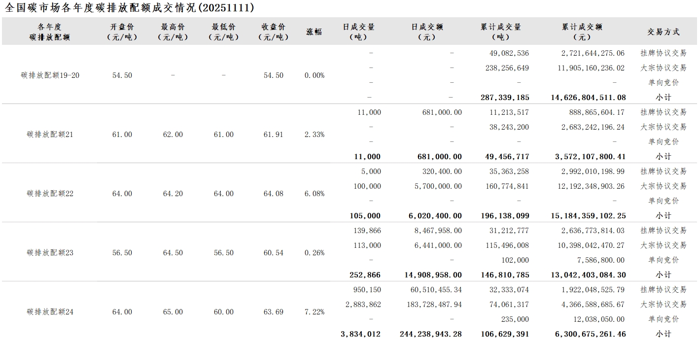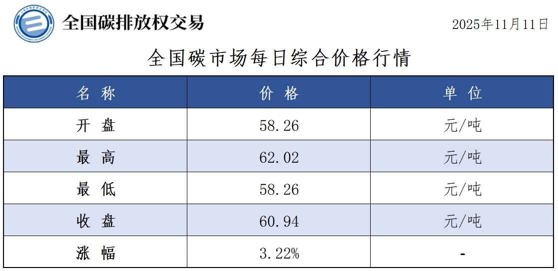 【CEA】全国碳市场每日综合价格行情及成交信息20251111
