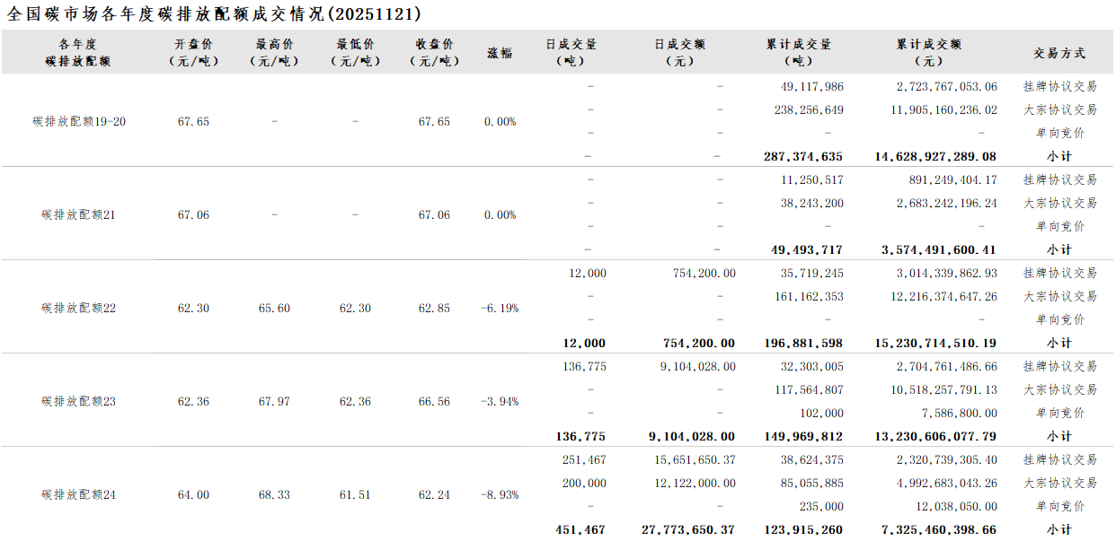 【CEA】全国碳市场每日综合价格行情及成交信息20251121