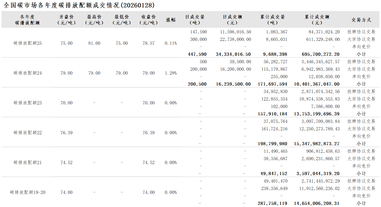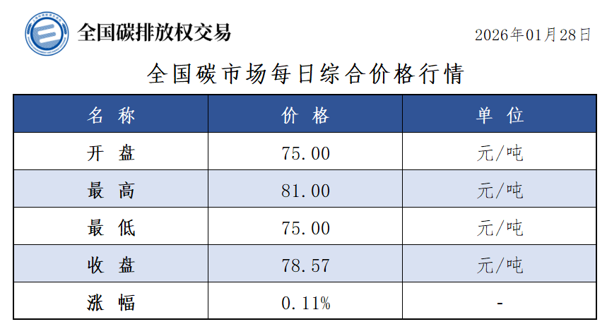 【CEA】全国碳市场每日综合价格行情及成交信息20260128
