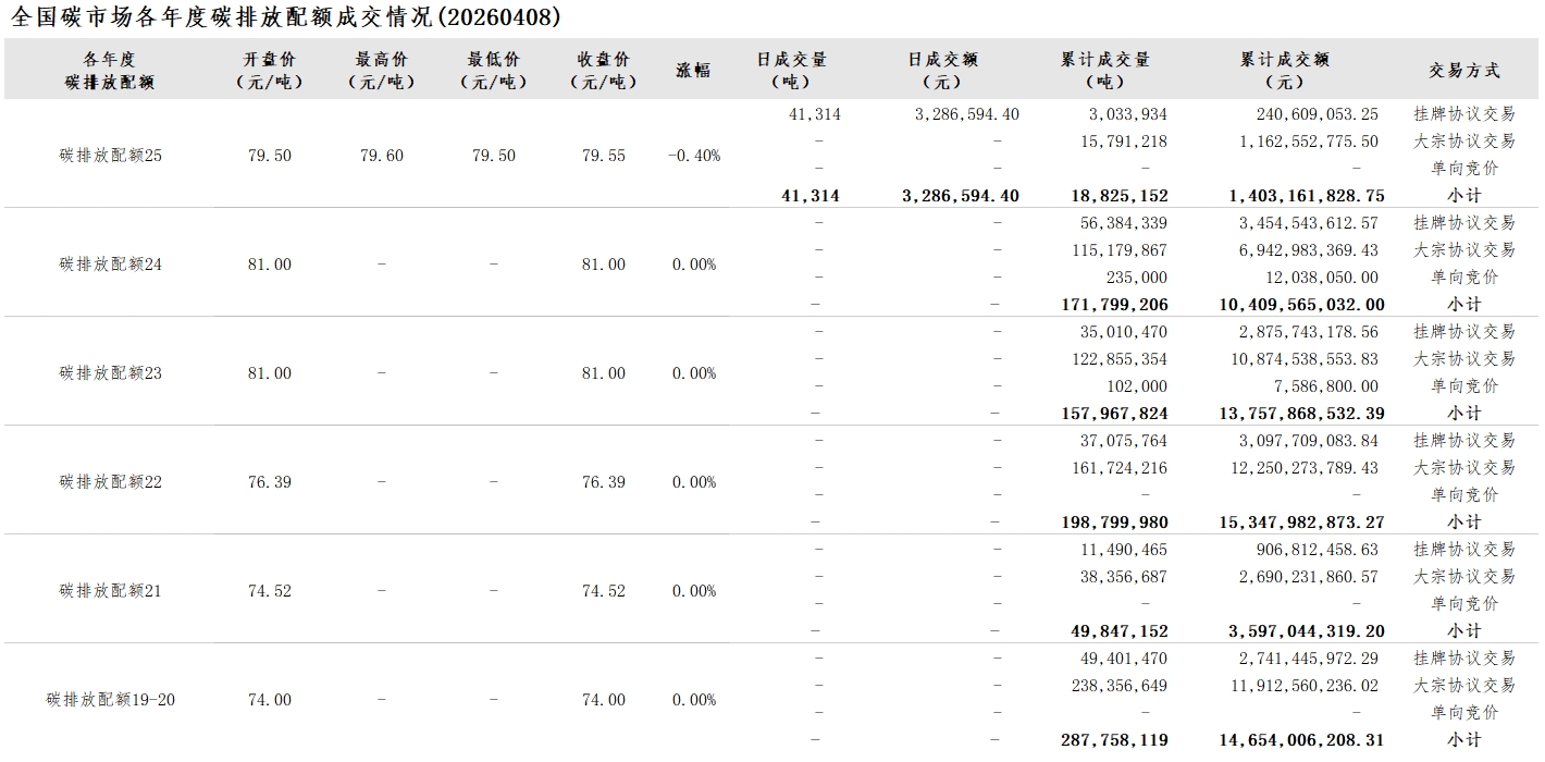 2026年1月1日至4月8日,全国碳市场碳排放配额成交量20,130,913吨,成交额1,507,010,562.35元。
